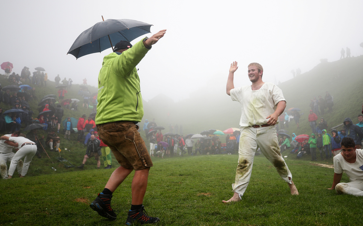 MARIA ALM, Austria (Reuters) - Every year around St. Jacob's Day, men from Austria's Salzburg region grapple with each other in a natural arena at the top of the Hundstein mountain in a traditional martial arts contest - the Hundstoa, or Jakobi Ranggeln.