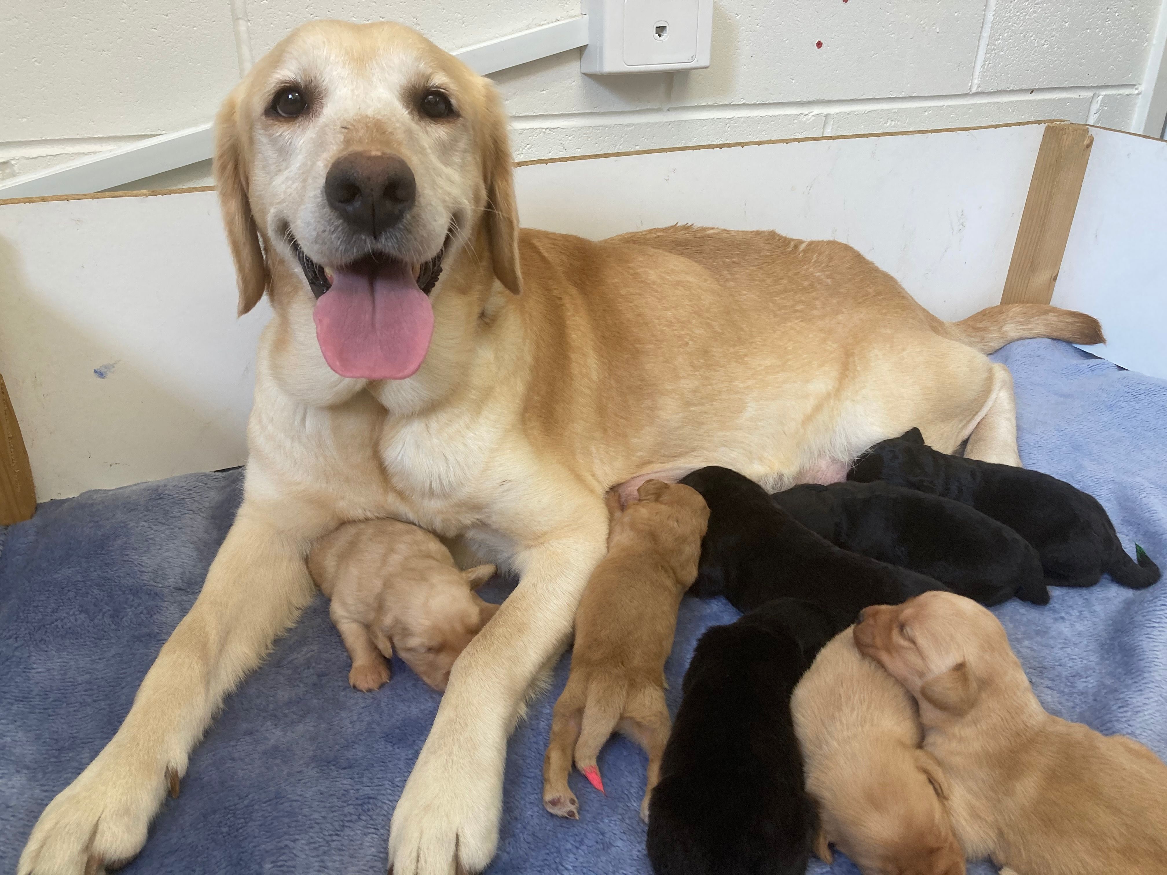 Pumpkin's eight puppies were found in a "filthy" box under the kitchen table, while Pumpkin herself was "noticeably thinner" and "in an emaciated state".
