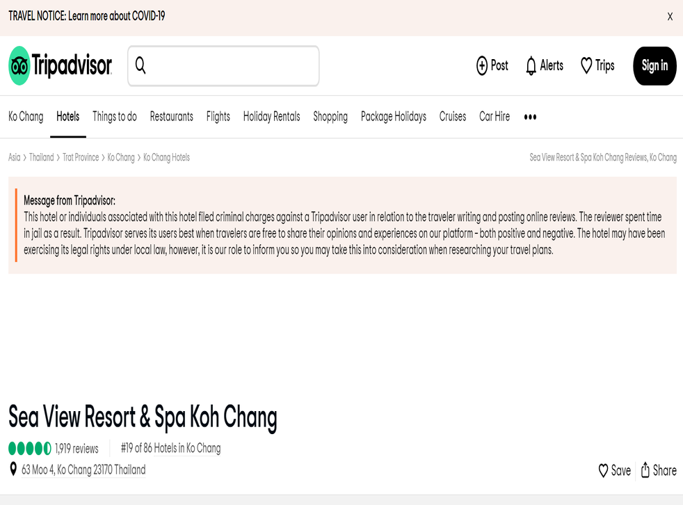 “However, Tripadvisor strongly opposes any action where a business, like the Sea View Hotel and Spa in Koh Chang, uses local law to send someone to jail for expressing their opinion.
