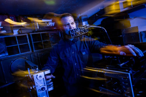 Over the past 18 years, Shone has built these and many other instruments, most recognizablly Rails, a forward-and-backward sliding, pistol-gripped controller programmed as a drum machine. “I’ve really had much better luck getting the sound that I want doing it myself,” says the musician, who speaks in measured tones, attempting (sometimes in vain) to break down his inventions for the casual admirer without delving too deeply into technical jargon and abstract explanations of how physical force translates into electronic sounds.