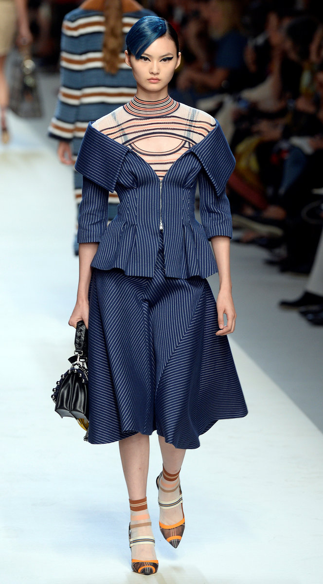 First down the catwalk was a geometric outfit with an off-the-shoulder, deep v-neck jacket in ocean blue and red and yellow stripes, matched with a knee-length skirt in the same symmetrical lined motif.