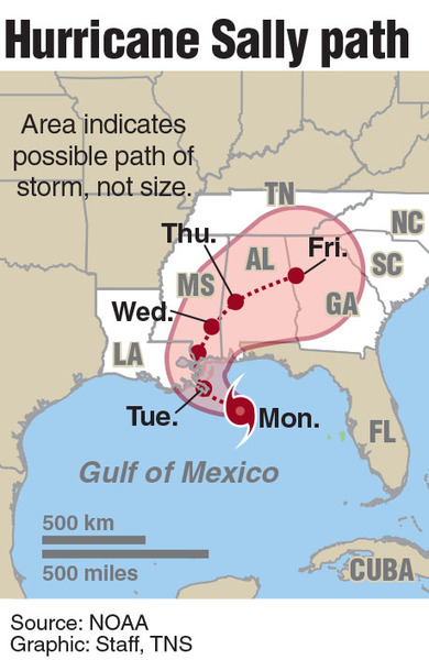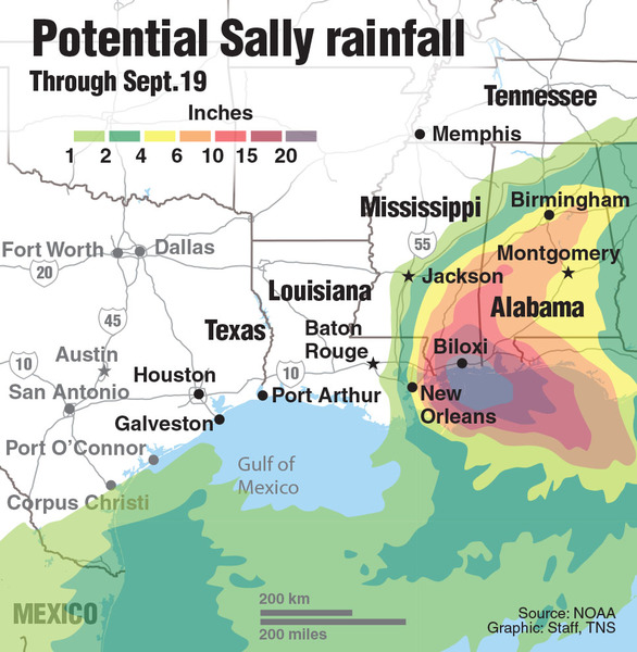 Sally rapidly became a Category 2 hurricane Tuesday afternoon, and forecasters warned it could strengthen further before landfall. But the real devastation could be in flooding. The hurricane center predicted that Sally could swamp Louisiana to the Florida Panhandle with storm surge and drenching rain. Some parts of Louisiana could see 11 feet of storm surge and up to two feet of rain.