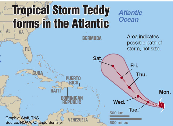 Forecasters said Teddy could strengthen into a hurricane as soon as Tuesday as the storm heads northwest toward Bermuda. The warm water, which is a few degrees hotter than average this year, is expected to help Teddy hit major hurricane-level strength by Thursday.