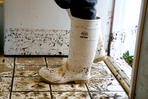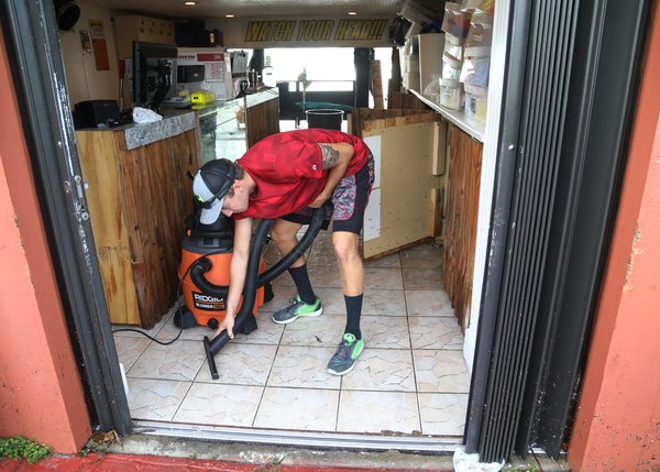 William Grinds, an employee of Fly- N-High Waverunners and Gators Parasail, cleans up water from the business, Thursday, November 12, 2020 at John's Pass Village, Madeira Beach. Several feet of water was pushed into the business at high tide, Wednesday night during Tropical Storm Eta. (Scott Keeler/Tampa Bay Times/TNS)