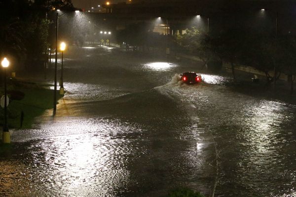 A motorist is seen attempting to drive on a flooded Bayshore Blvd as Tropical Storm Eta sends torrential downpours, storm surge flooding and wind across the Tampa Bay Area on November 12, 2020. (Luis Santana/Tampa Bay Times/TNS)