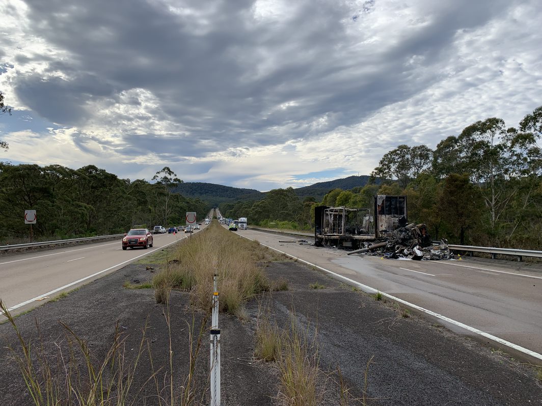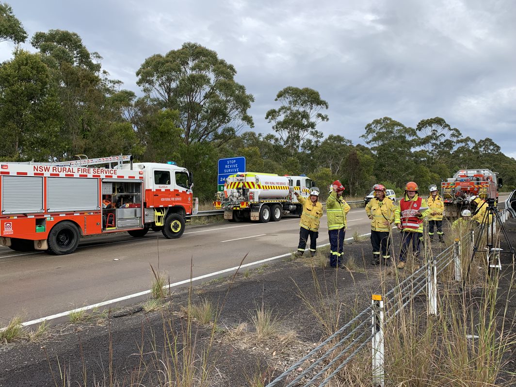 Emergency services are on the scene, including the Rural Fire Service and a Fire and Rescue NSW Hazmat vehicle to manage fuel.