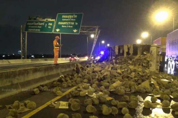 SAMUT PRAKAN: A truck with a full load of durian overturned on Bangkok’s southern ring road, dumping its cargo of fruit on the road, early on Monday morning.