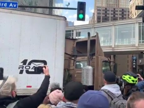 One demonstrator was forced to jump off the hood of the truck, causing further outrage among bystanders.