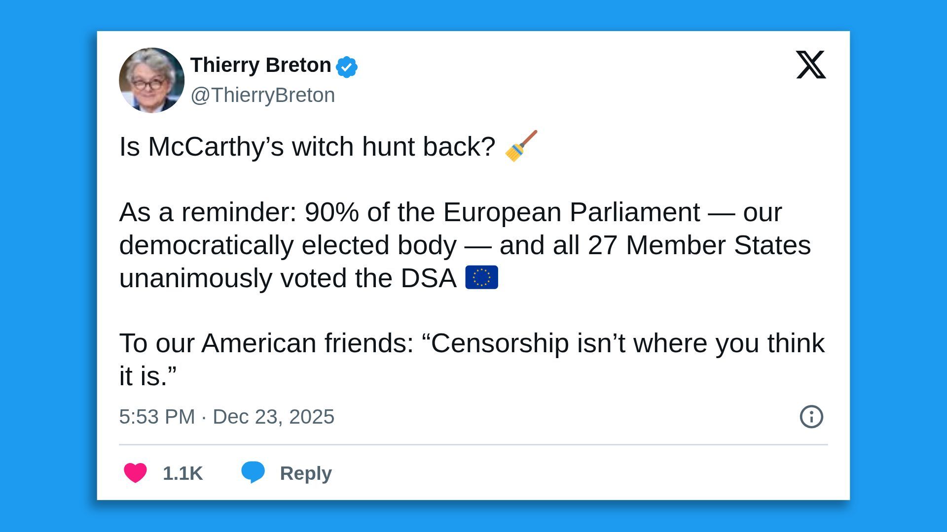 - He wrote on X that for "far too long, ideologues in Europe have led organized efforts to coerce American platforms to punish American viewpoints they oppose."