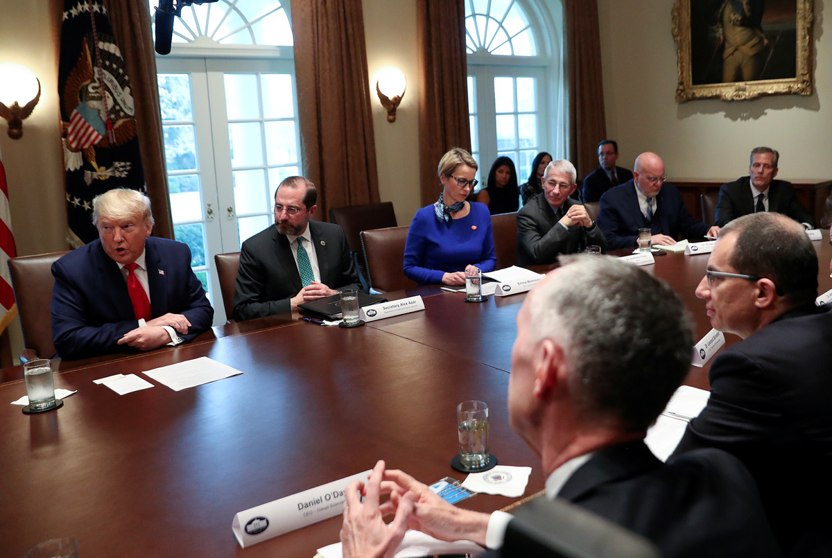 At a meeting with industry executives at the White House, President Donald Trump exhorted the companies to collaborate to speed the process of getting a vaccine and therapeutics to victims of the virus.