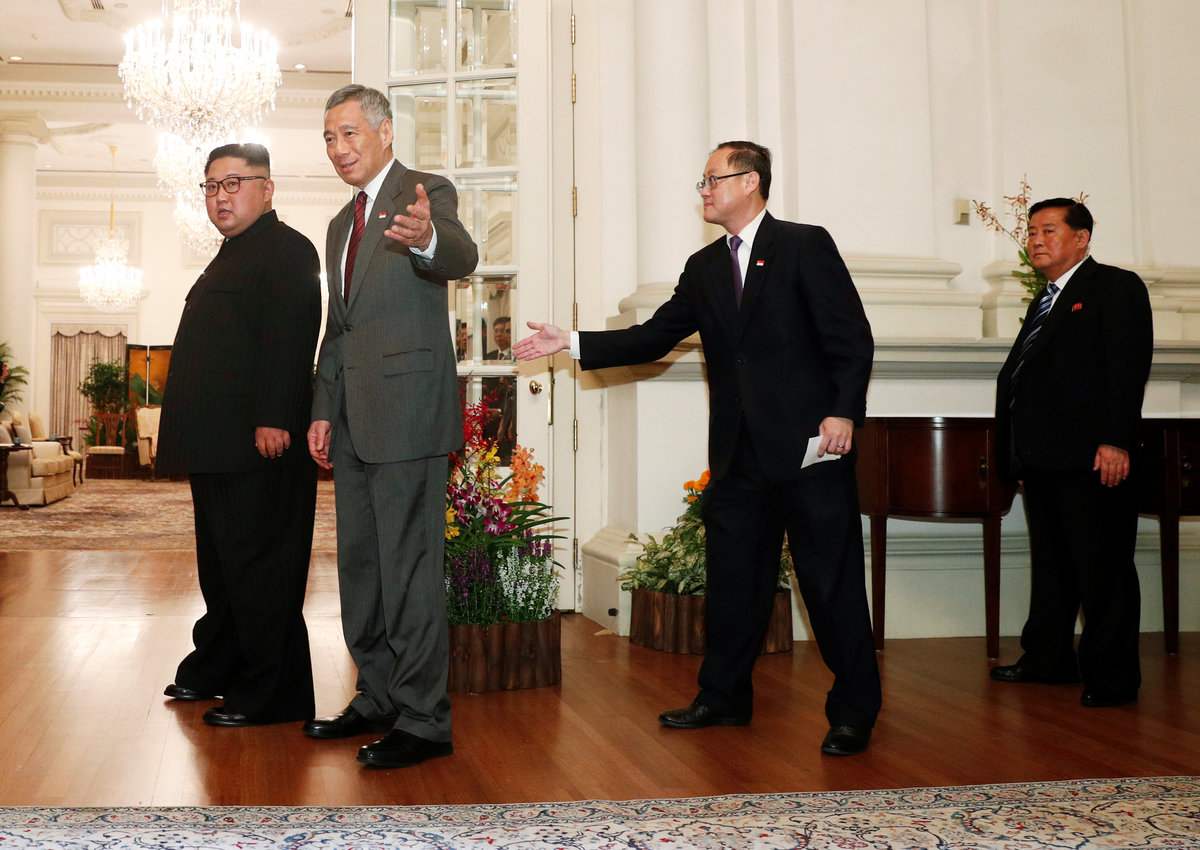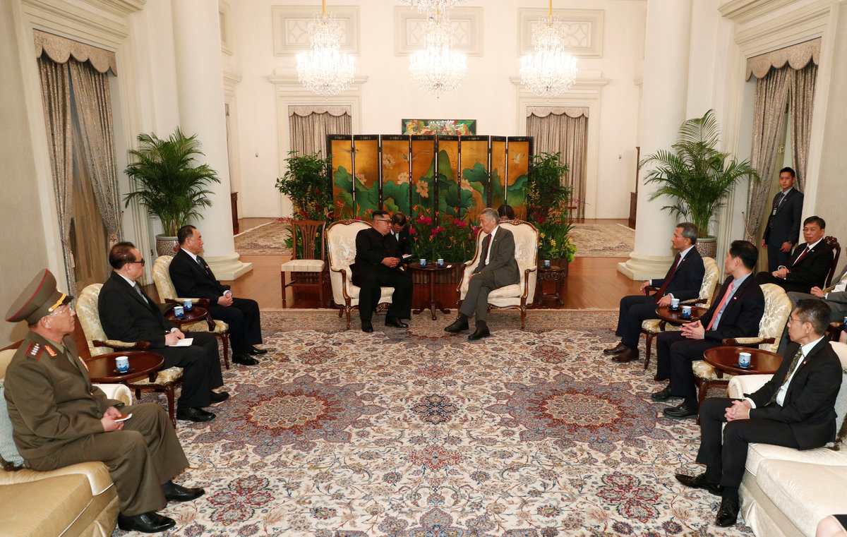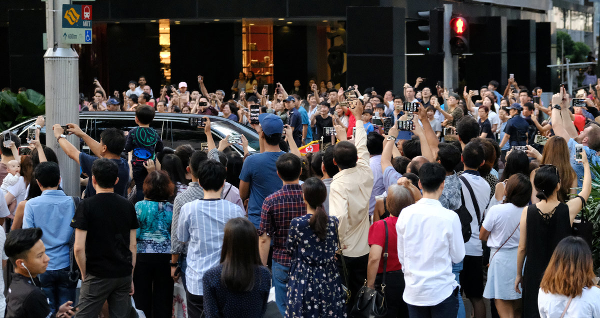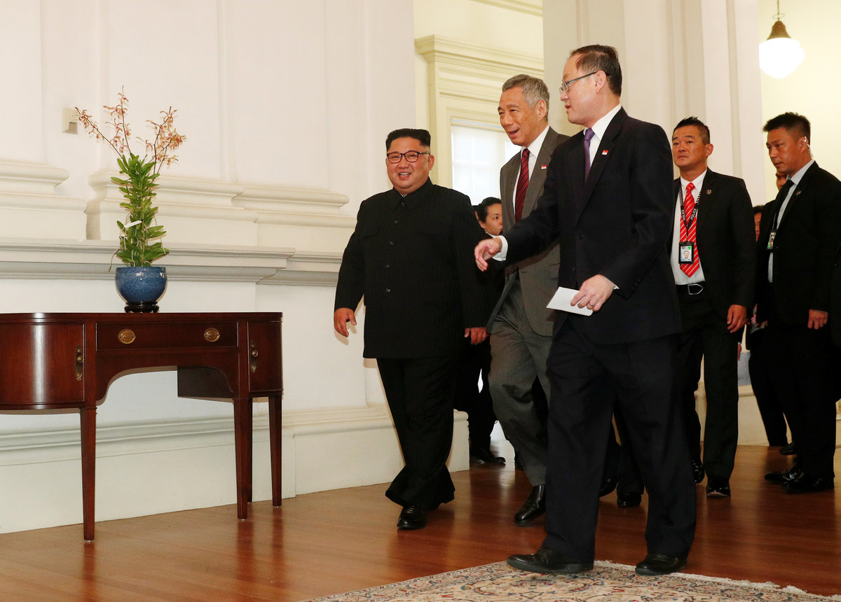 Kim met Singapore Prime Minister Lee Hsien Loong shortly after his arrival, driving from the St. Regis Hotel where he is staying, through the famous Orchard Road shopping district, which was closed off for his tightly guarded motorcade.