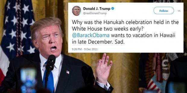 Donald Trump called former President Barack Obama “sad” for hosting the White House Hanukkah party early. But he just did the same thing.