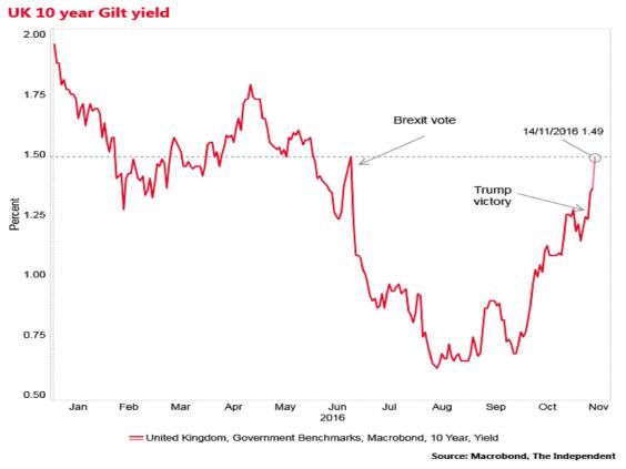 The UK’s 10-year borrowing costs have now risen above the level at the time of the Brexit vote – increasing the cost to the Government of funding the national debt and with City of London analysts pointing to the spillover affect of Donald Trump's presidential election victory in the US.