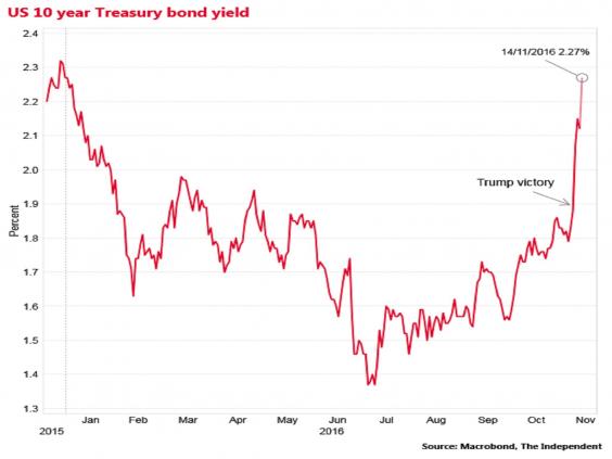 US government borrowing costs have also been rising in the wake of the election of Donald Trump, with 10-year Treasury yields spiking from 1.88 per cent last Wednesday to 2.276 per cent today.