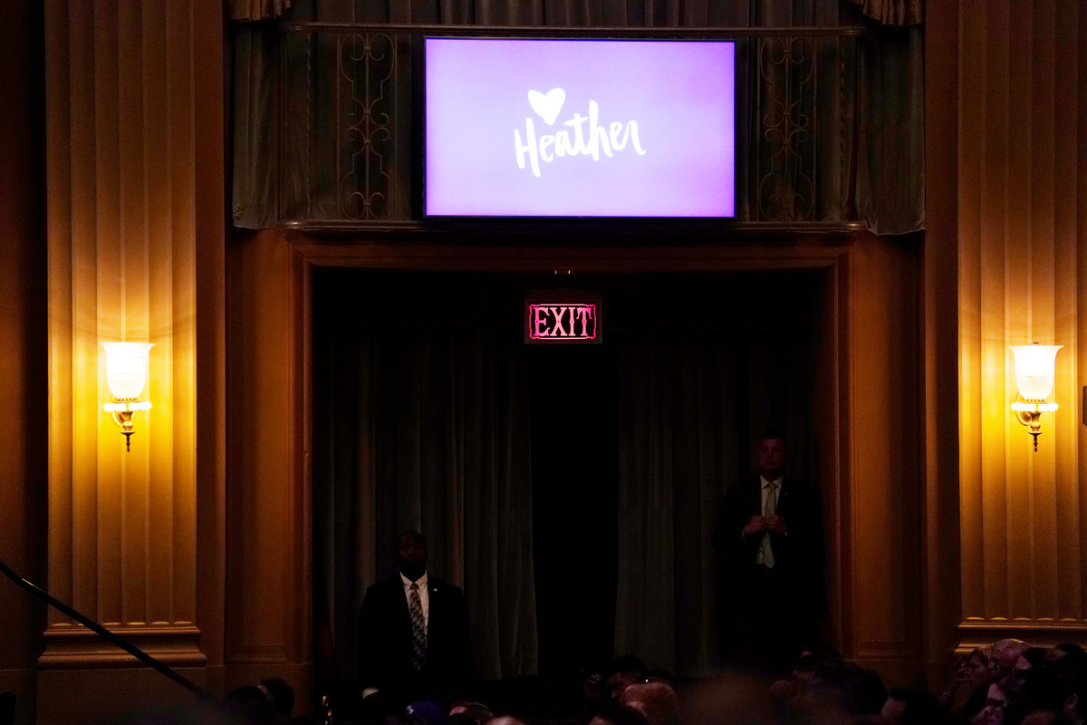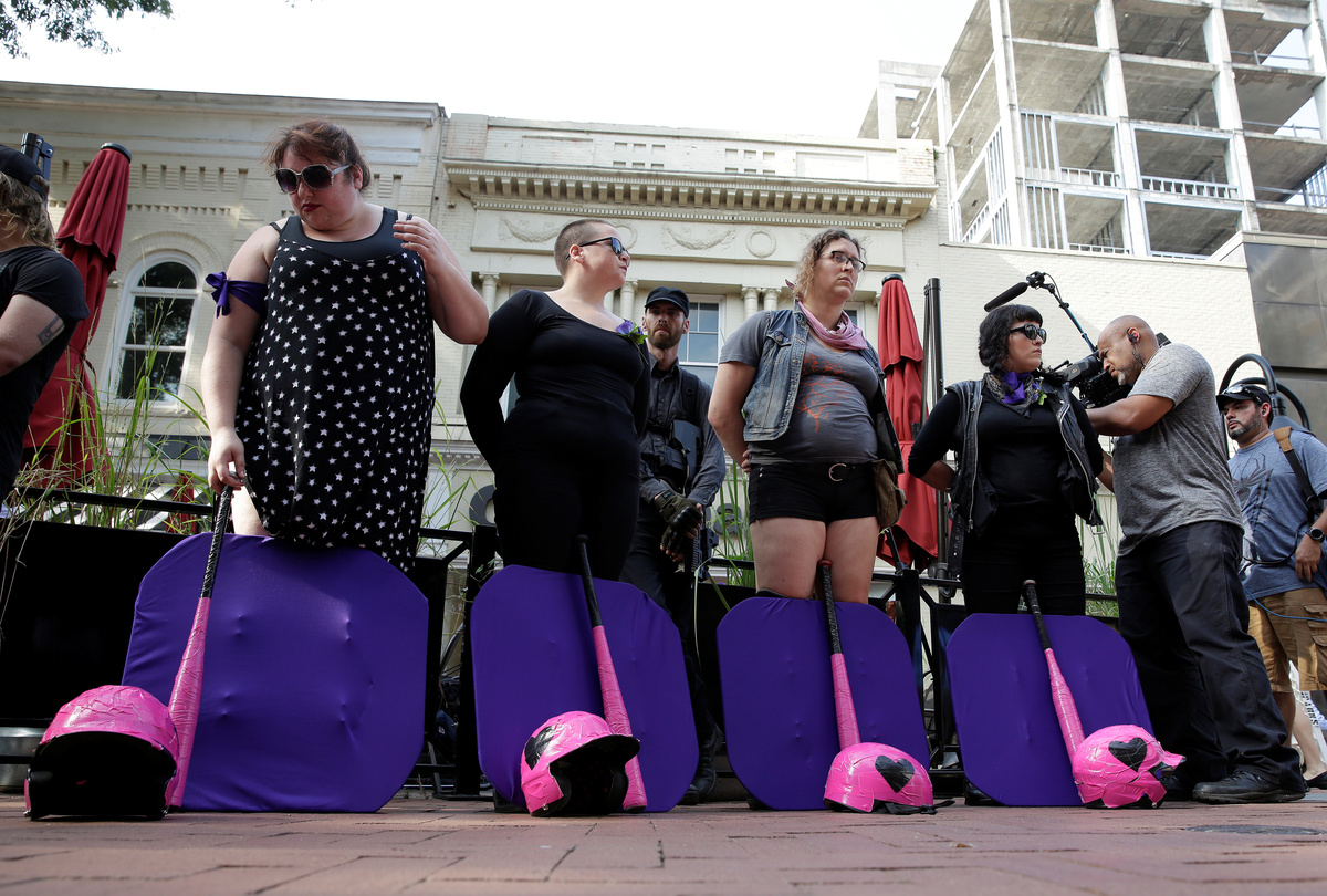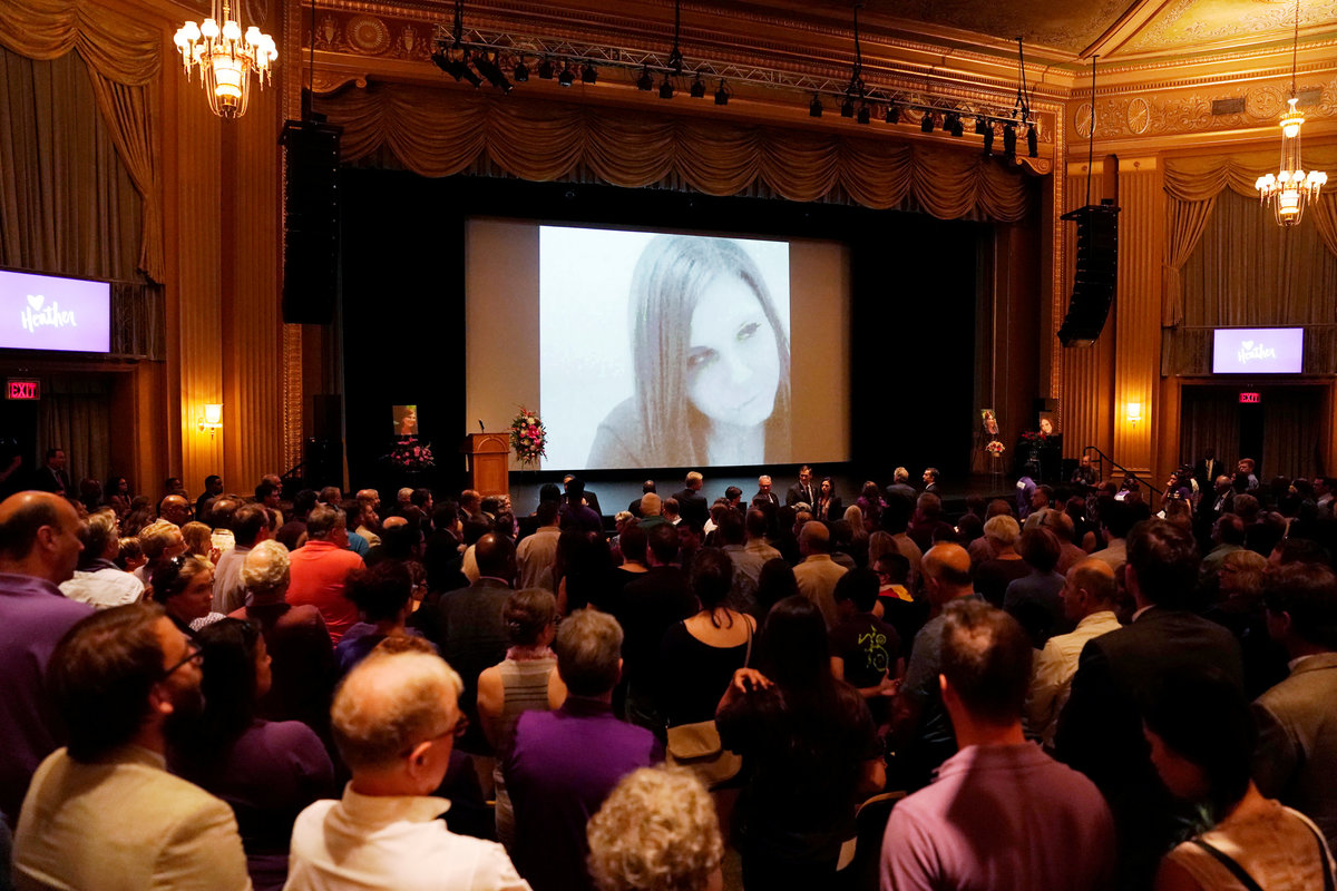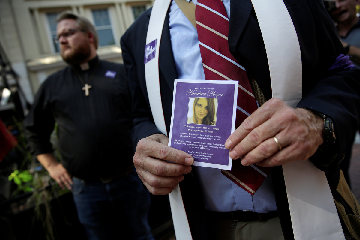 People in an over flow area watch the memorial service for Heather Heyer, who was killed when a suspected white nationalist crashed his car into anti-racist demonstrators, in Charlottesville, Virginia, U.S., August 16, 2017. REUTERS/Joshua RobertsMourners gather and hug inside the Paramount Theater for a memorial service for car attack victim Heather Heyer (seen in photograph at rear) who was kileld during the "Unite the Right" rally and protests in Charlottesville, Virginia, U.S., August 16. 2017. REUTERS/Jonathan ErnstCar attack victim Heather Heyer's father Mark Heyer arrives for her memorial service inside the Paramount Theater in Charlottesville, Virginia, U.S., August 16. 2017. REUTERS/Jonathan ErnstMourners gather inside the Paramount Theater for a memorial service for car attack victim Heather Heyer in Charlottesville, Virginia, U.S., August 16. 2017. REUTERS/Jonathan ErnstA member of the clergy holds a picture of Heather Heyer as they stand outside of her memorial service. REUTERS/Joshua RobertsA cameraman stands among mourners and police outside the Paramount Theater prior to a memorial service for car attack victim Heather Heyer in Charlottesville, Virginia, U.S., August 16. 2017. REUTERS/Jonathan ErnstPeople carrying bats and shields to provide security in the event of far-right protesters stand outside the memorial service for Heather Heyer, who was killed at in a far-right rally in Charlottesville, Virginia, U.S., August 16, 2017. REUTERS/Joshua RobertsMourners gather inside the Paramount Theater for a memorial service for car attack victim Heather Heyer in Charlottesville, Virginia, U.S., August 16. 2017. REUTERS/Jonathan ErnstPeople line up to attend the memorial service for Heather Heyer, who was killed at in a far-right rally in Charlottesville, Virginia, U.S., August 16, 2017. REUTERS/Joshua RobertsA sign on the statue of Robert E. Lee calls for the park to be renamed for Heather Heyer, who was killed at in a far-right rally, in Charlottesville, Virginia, U.S., August 16, 2017. REUTERS/Joshua RobertsPeople gather for a vigil in response to the death of a counter-demonstrator at the "Unite the Right" rally in Charlottesville, outside the White House in Washington. REUTERS/Jonathan ErnstA man wears a purple ribbon to remember Heather Heyer, who was killed at in a far-right rally, as he arrives for her memorial service in Charlottesville, Virginia, U.S., August 16, 2017. REUTERS/Joshua RobertsU.S. President Donald Trump salutes as he steps from Air Force One at Kennedy Airport in New York, U.S., August 14, 2017. REUTERS/Kevin Lamarque
