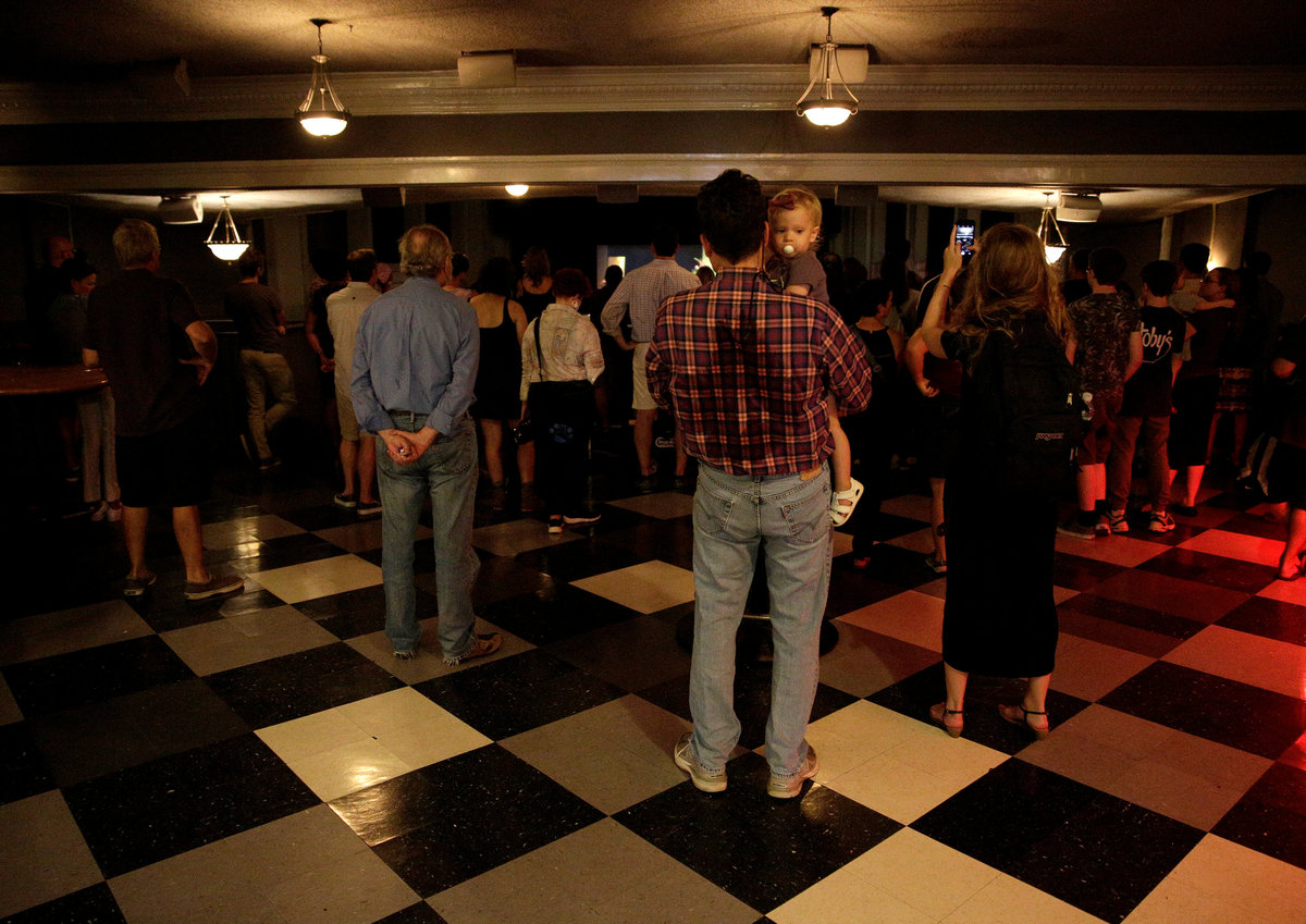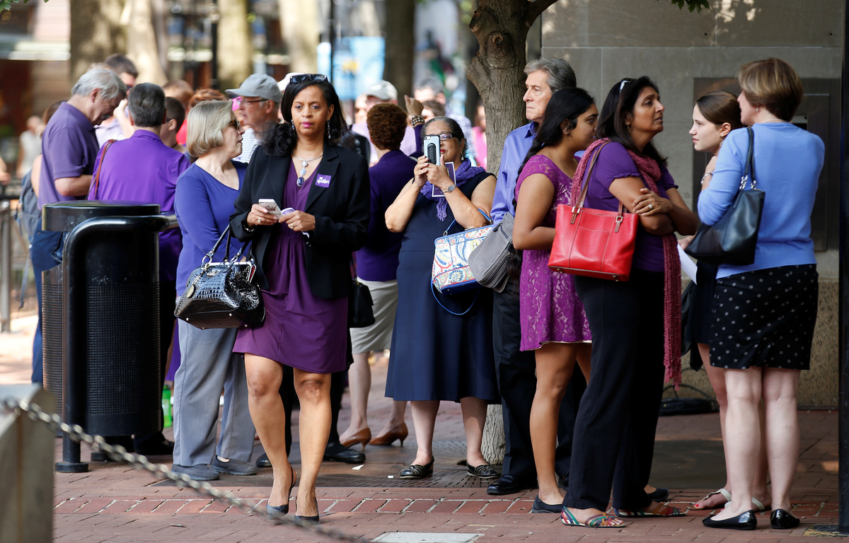 People in an over flow area watch the memorial service for Heather Heyer, who was killed when a suspected white nationalist crashed his car into anti-racist demonstrators, in Charlottesville, Virginia, U.S., August 16, 2017. REUTERS/Joshua Roberts