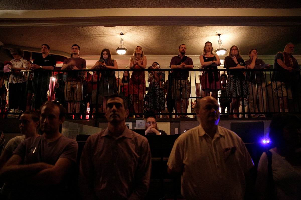 Police keep watch inside the Paramount Theater during a memorial service for car attack victim Heather Heyer in Charlottesville, Virginia, U.S., August 16. 2017. REUTERS/Jonathan Ernst