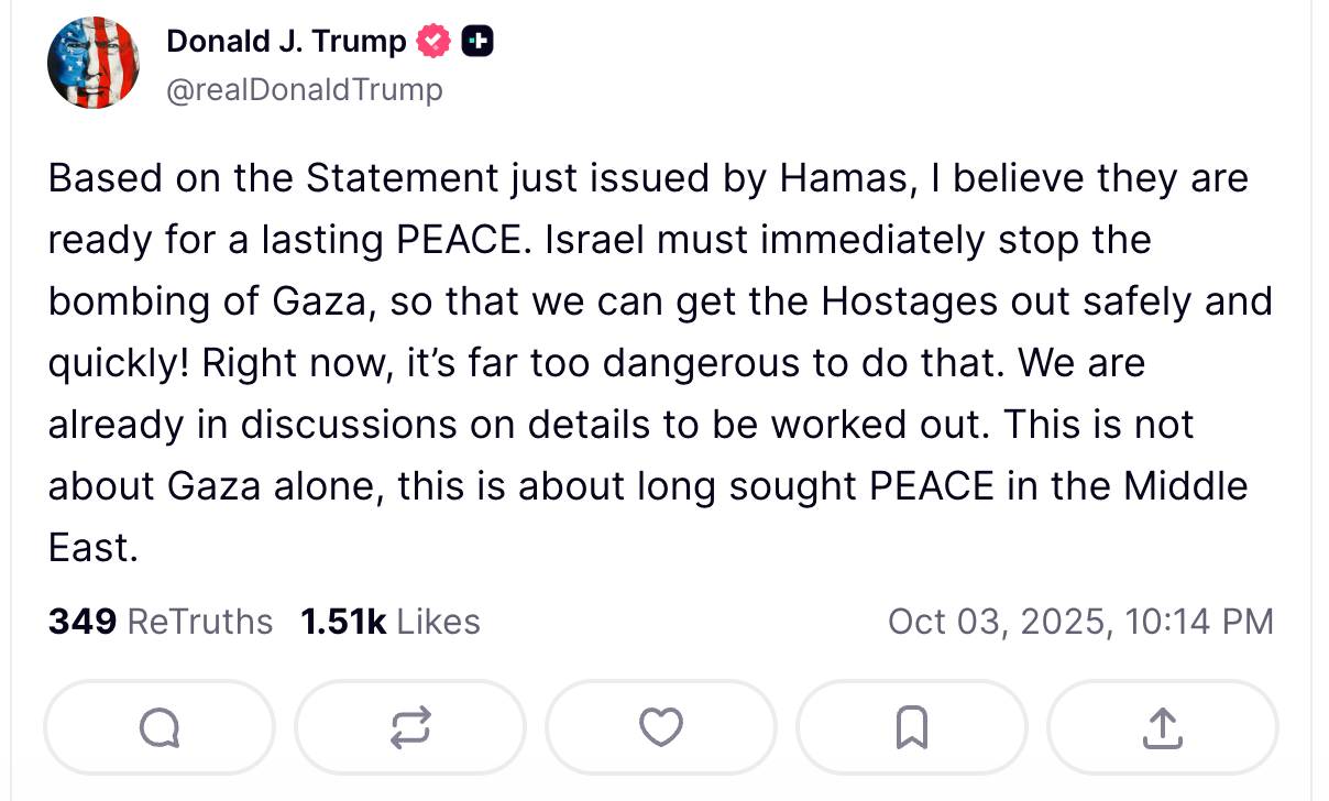 Trump wrote on Truth Social: “Israel must immediately stop the bombing of Gaza, so that we can get the Hostages out safely and quickly!”
