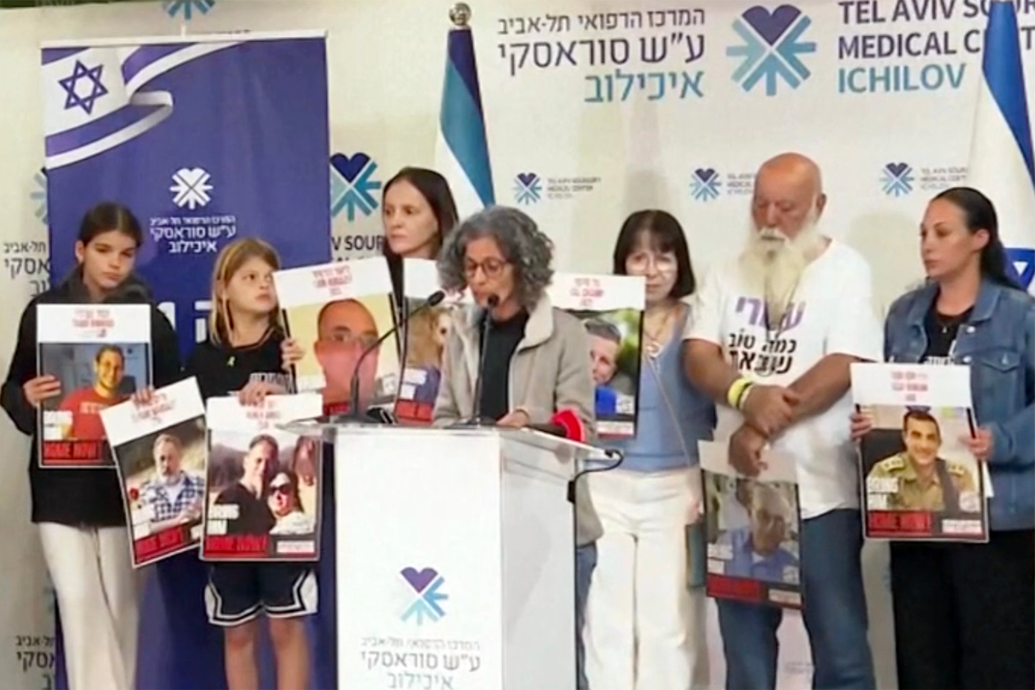 Tuesday 14 October 2025 18:43 , Alex CroftA group of family members of the hostages are giving statements at Ichilov Hospital.