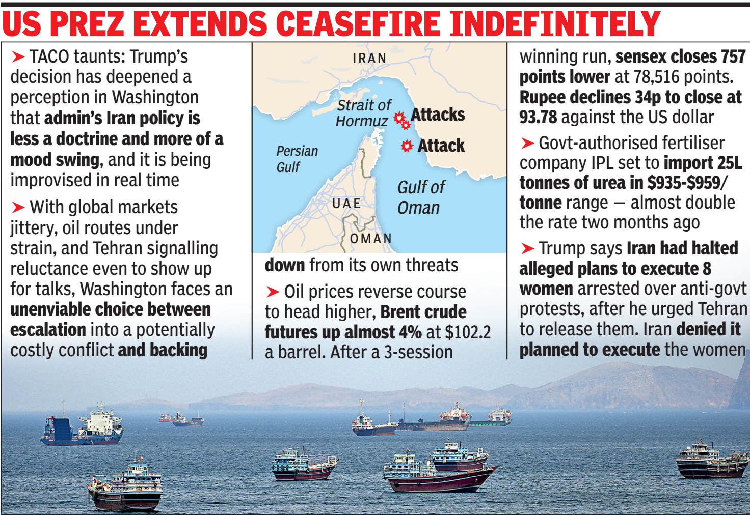 President Donald Trump changed his aggressive stance on Iran and extended the ceasefire indefinitely, even as Iran’s Revolutionary Guard on Wednesday fired on three ships in the Strait of Hormuz, seized two of them and was bringing them to Iran, according to Iranian media.
