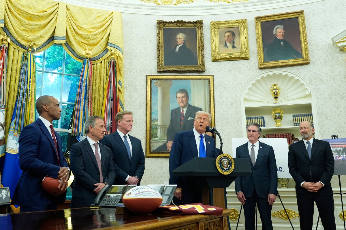 President Donald Trump hosted National Football League commissioner Roger Goodell and Washington Commanders owner Josh Harris in the Oval Office on Monday to announce that the nation’s capital will host the 2027 NFL draft on the National Mall.