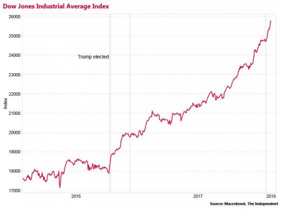 “Dow goes from 18,589 on November 9, 2016, to 25,075 today, for a new all-time….Record fastest 1000 point move in history… Six trillion dollars in value created,” he tweeted on 5 January, one of many such market-related boasts to have emanated from Mr Trump over the past year.