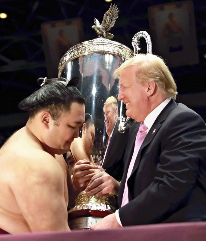 At the awards presentation ceremony, Trump got into the ring and handed the "President's Cup," specially made for the occasion, to the winner, No. 8 maegashira Asanoyama.
