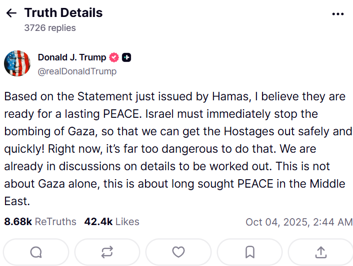 In a post on Truth Social, Trump said he believes Hamas is ready "for a lasting PEACE," after the U.S.-designated terrorist organization agreed "to release all Israeli prisoners, both living and dead, according to the exchange formula contained in President Trump's proposal."