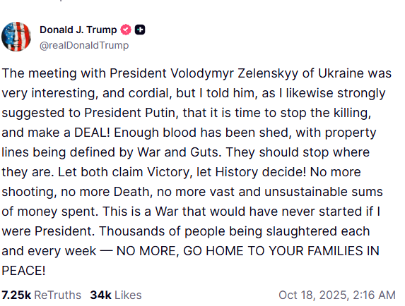 Trump wrote on Truth Social that he "strongly suggested to President Putin that it is time to stop the killing and make a deal."