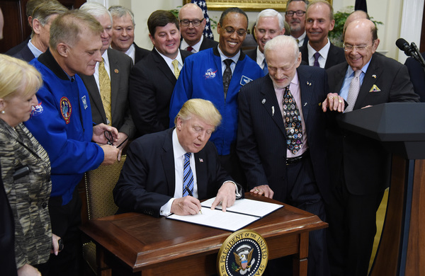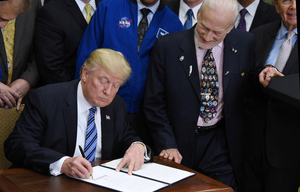 Buzz Aldrin, the former Apollo 11 U.S. astronaut who along with mission commander Neil Armstrong became one of the first two people to walk on the moon in 1969, was at the White House for the signing ceremony.
