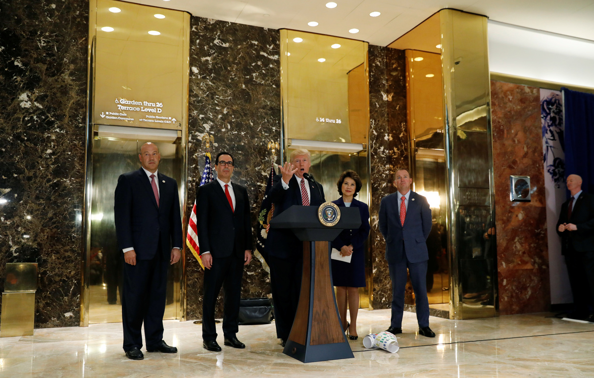 Cohn, along with Treasury Secretary Steven Mnuchin and Transportation Secretary Elaine Chao, stood by Trump during his remarks at Trump Tower on Tuesday. Cohn in particular looked self-conscious and uncomfortable.