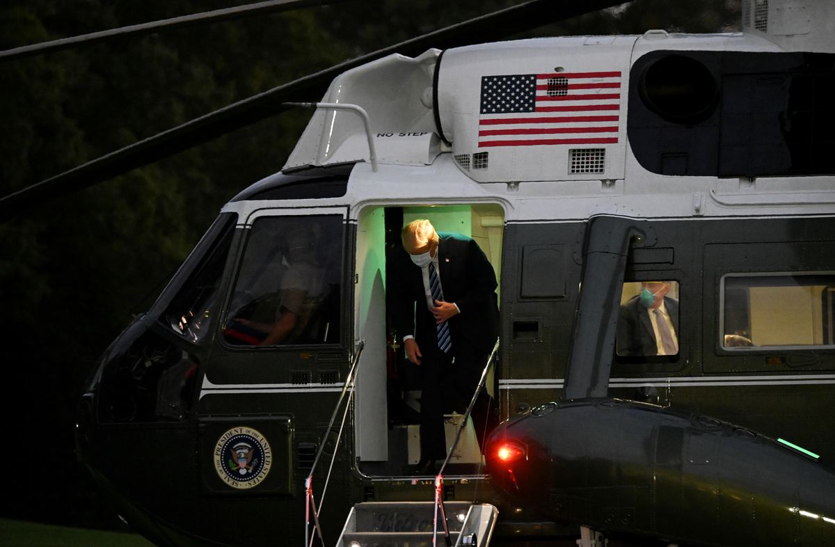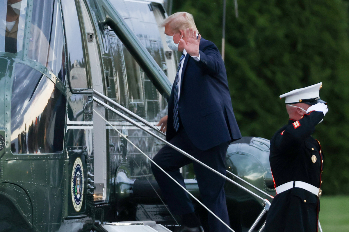 Trump wore a mask as he left the helicopter that flew him back from a military hospital outside Washington and climbed the stairs of the White House South Portico, where he removed it and posed for pictures, waving, saluting and giving thumbs-up signs.