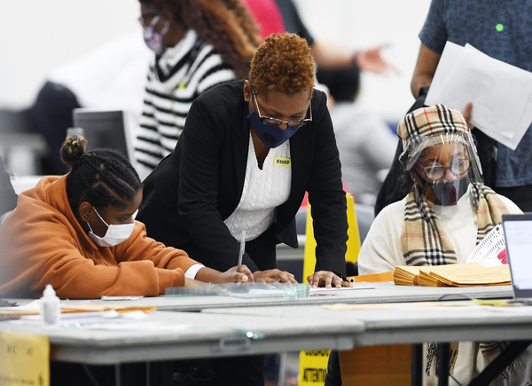 Poll inspectors count and process absentee ballots at the TCF Center on Tuesday, Nov. 4, 2020, Detroit, Michigan. (Clarence Tabb, Jr./The Detroit News/TNS)