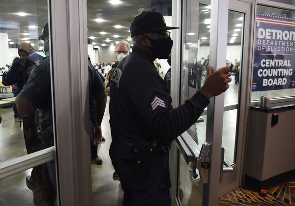Detroit Police officers prevent MIGOP election challengers from entering the Central Counting Board hall on Tuesday, Nov. 4, 2020, Detroit, Michigan. (Clarence Tabb, Jr./The Detroit News/TNS)