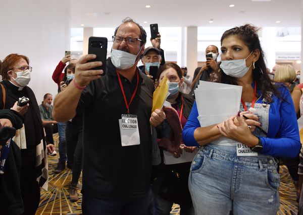 MIGOP election challengers yell at the police after they were pushed back and prevented from entering the Central Counting Board hall on Tuesday, Nov. 4, 2020, Detroit, Michigan. (Clarence Tabb, Jr./The Detroit News/TNS)
