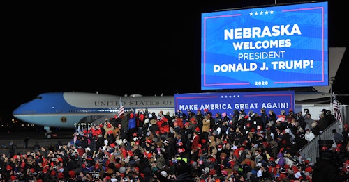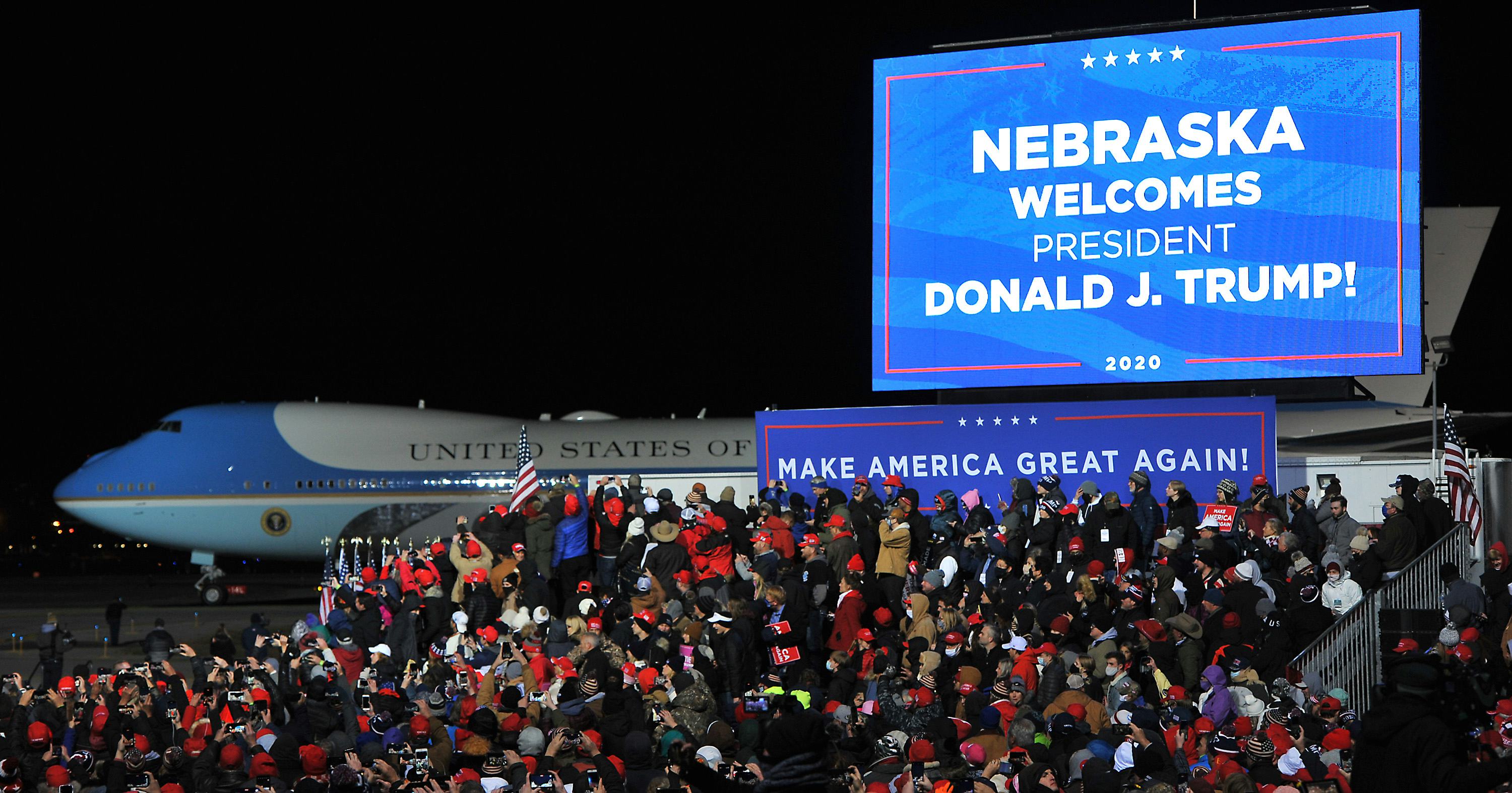 While the image of the president jetting out of town aboard a state-of-the-art aircraft while his most fervent supporters literally freeze is perhaps a little too on the nose, metaphor-wise — particularly given the fact that the thousands of attendees had already risked their health by cramming together in the midst of a viral pandemic — it should not be lost in the "is this irony, or inevitability?" debate that Trump's very appearance in Nebraska is a sign of just how worried he is about the upcoming presidential election. In 2016, Trump took the traditionally red state by double digits over Hillary Clinton, but this year Joe Biden is poised to win at least one of the state's electoral points, which are split between statewide and district winners. The fact that a Republican candidate is campaigning there at all reveals a cold, hard truth.