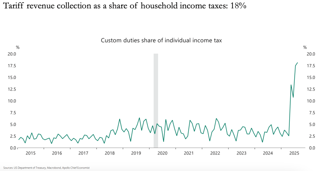 The U.S. government is currently collecting tariff revenues at an annualized pace of roughly $350 billion, a “significant” amount, according to Torsten Slok, chief economist at Apollo Global Management. In his typical style, one of brevity and striking charts, Slok added that the figure equates to roughly 18% of annual household income tax payments, underscoring that tariffs are not a marginal tool but a significant revenue source shaping America’s economic and trade landscape.