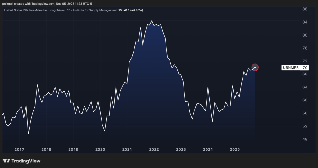 In October, the ISM Services Prices Index jumped to 70%, the highest reading in three years and a level not seen since October 2022. It’s now been above 60% for 11 straight months.