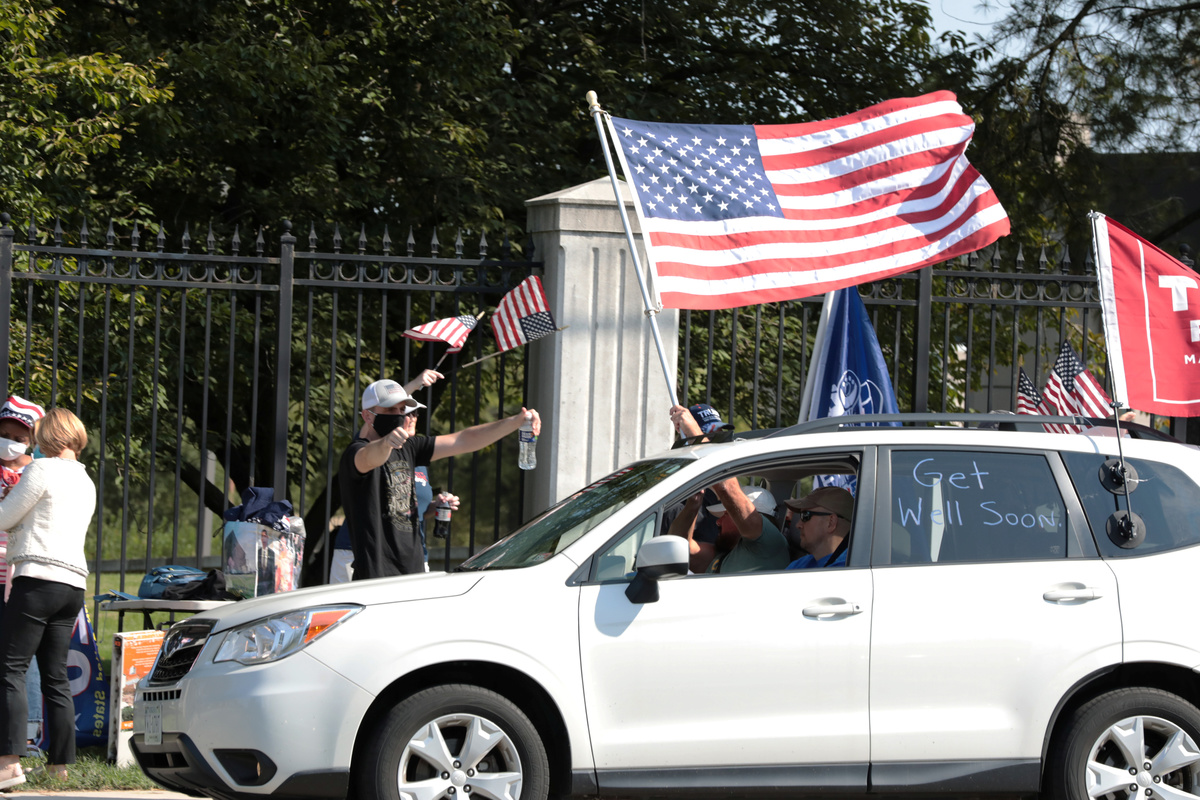 Trump, 74, wore a mask as he waved from the back seat of a black SUV that crawled in a caravan of vehicles in front of the Walter Reed National Military Medical Center outside Washington, while supporters waving Trump 2020 flags chanted: "USA! USA!"