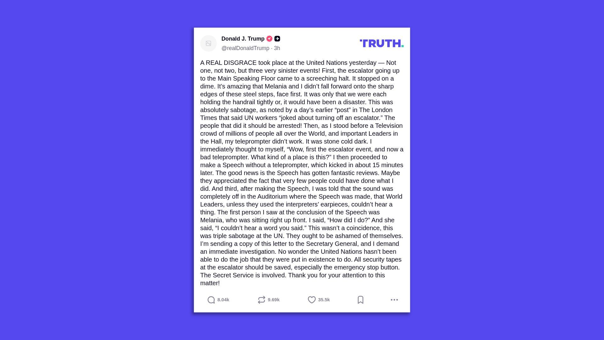 - "This wasn't a coincidence, this was triple sabotage at the UN. They ought to be ashamed of themselves," Trump said. "All security tapes at the escalator should be saved, especially the emergency stop button. The Secret Service is involved."