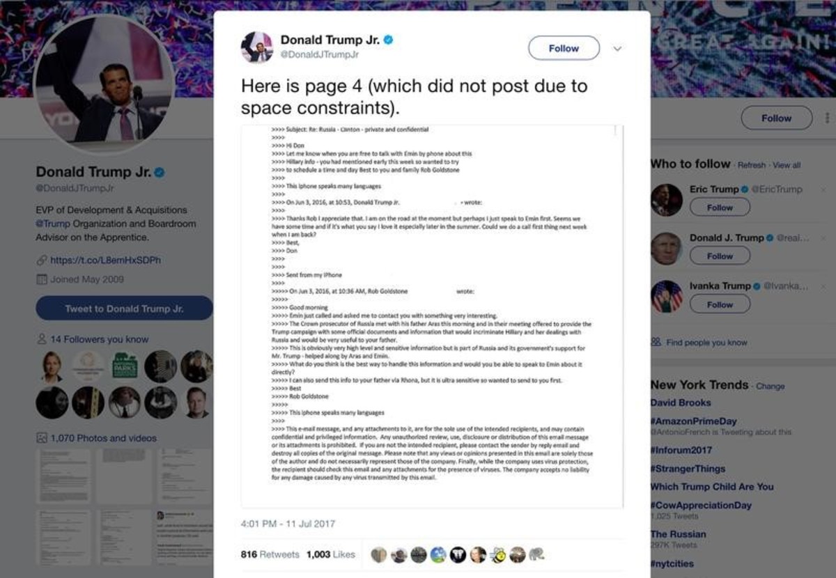 The emails do not appear to provide evidence of illegal activity, but legal experts say Trump Jr. could run into trouble if investigators find he aided a criminal action, such as hacking into Democratic computer networks, or violated campaign-finance laws by accepting gifts from foreign entities.