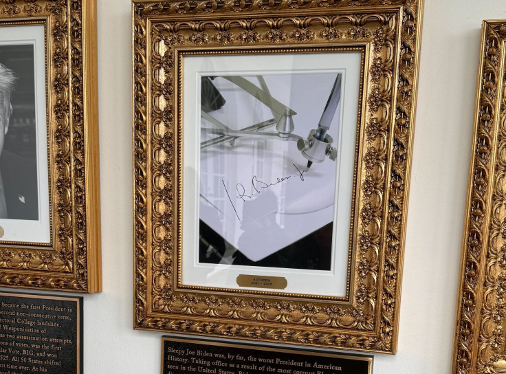 Under Joe Biden's space, the plaque calls him "by far, the worst President in American History" and repeats the unfounded assertion that he assumed office "as a result of the most corrupt election ever seen in the United States," directly contradicting official Electoral College results and certified election outcomes.