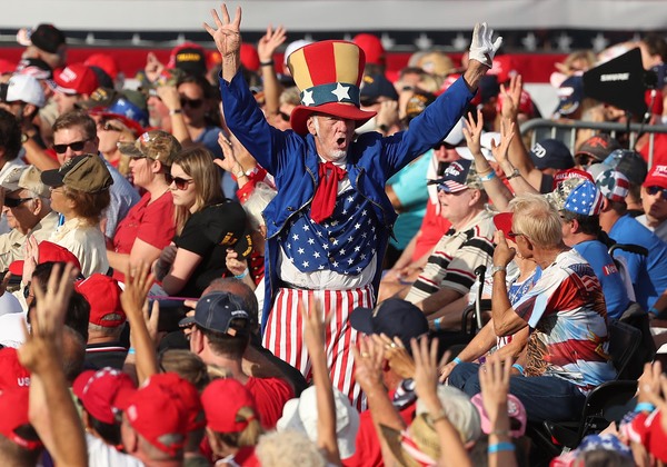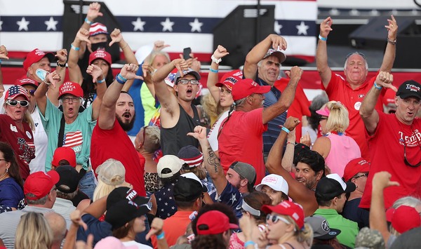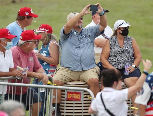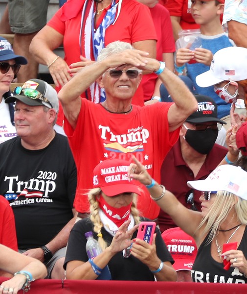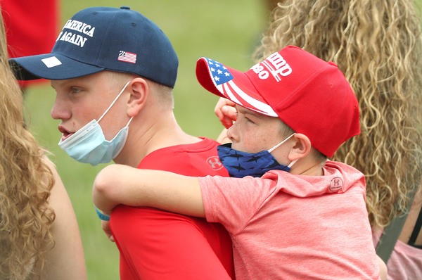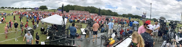 Two hours before the event began, nearly every folding chair was occupied in the barricaded off a portion of the pitch. Much of the mostly older crowd sat shoulder to shoulder, and fewer than half were wearing masks.