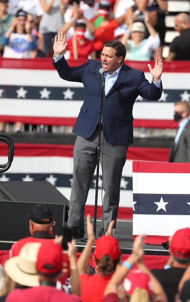 In a warm-up speech, Florida Gov. Ron DeSantis said a victory for Joe Biden would lead to nationwide lockdowns to combat the virus, and he offered up Florida as a model for the country, despite a recent surge in positive cases.