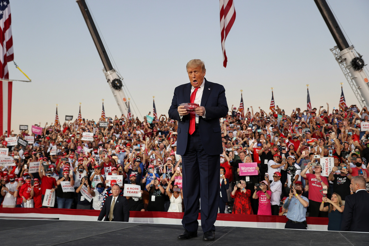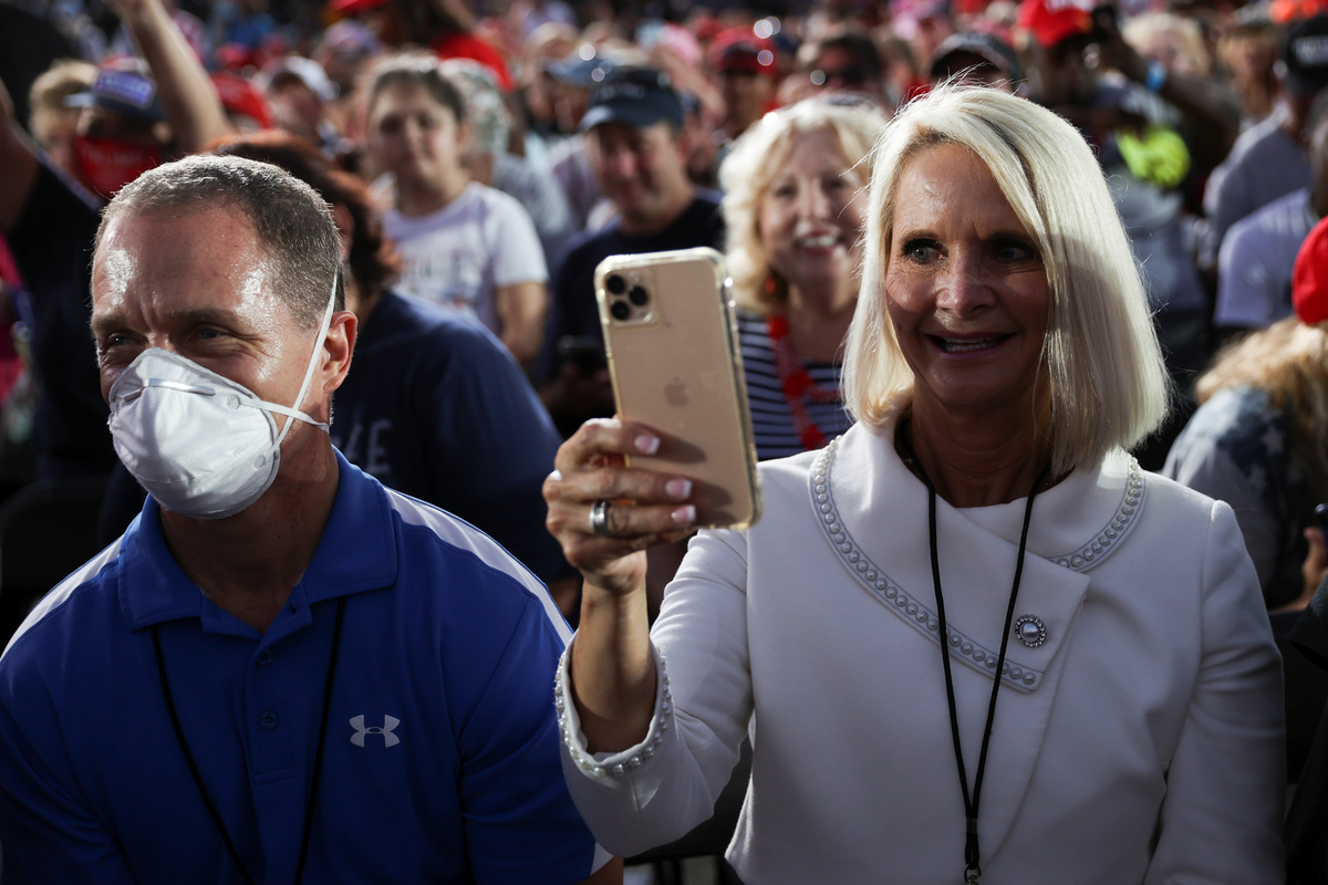 Trump arrived at the outdoor rally in Sanford, Florida, the first of six planned for this week, without a protective mask. He tossed out masks to thousands of supporters standing shoulder to shoulder, most without protective face coverings, and repeatedly talked about his recovery from the coronavirus.