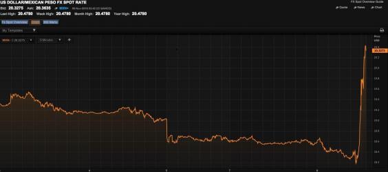 The Mexican Peso is down more than 10 per cent against the US Dollar, breaching $20 for the first time, as traders anticipate that a President Trump would impose policies that damage the Mexican economy.