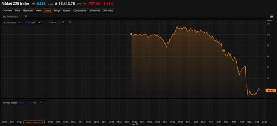 Japan's Nikkei 225 Index is down by 4.25 per cent since it opened.