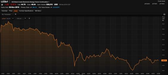 The global oil price is down 3 per cent at $44.68 per barrel.