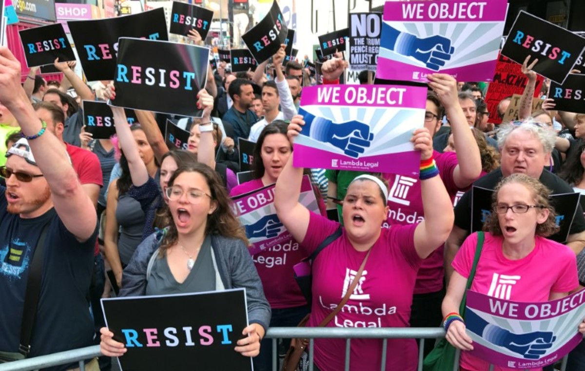 "We are in a crisis. This is a dark day for everyone," Brad Hoylman, New York's sole openly gay state senator, said as he addressed the crowd, which carried "Resist" signs amid chants of: "Hey-hey, ho-ho, Donald Trump has got to go."