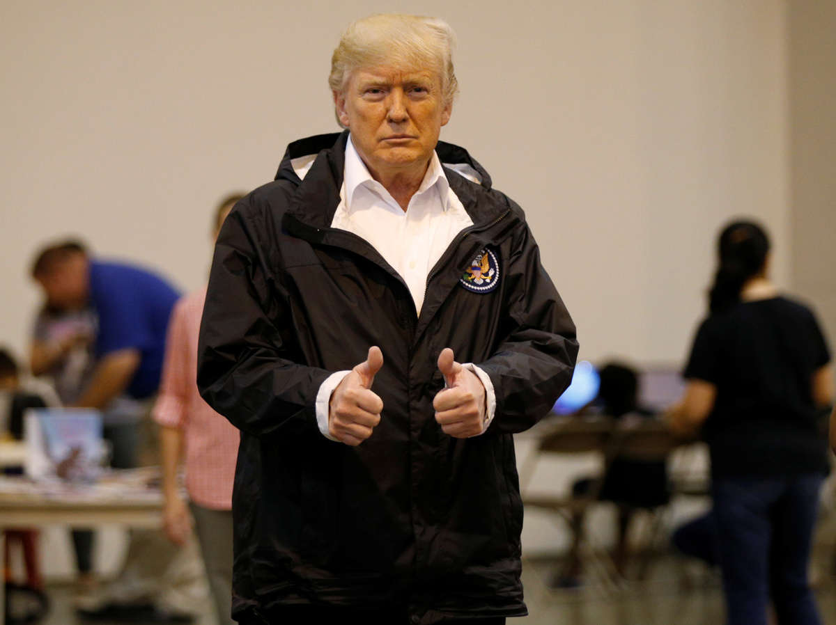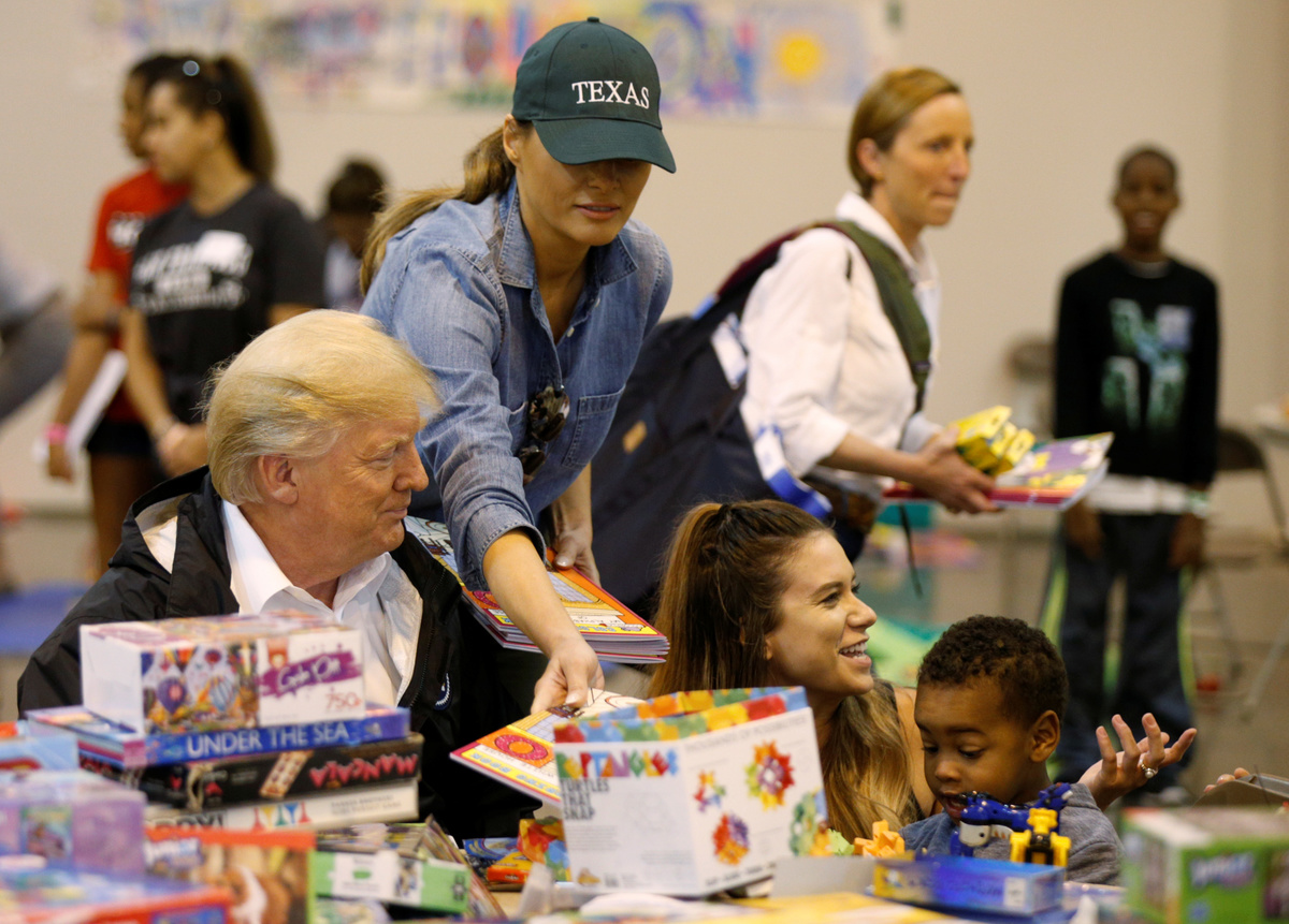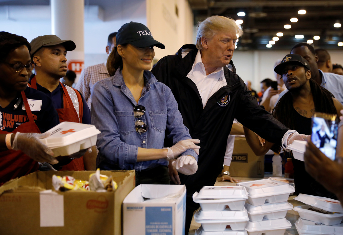 President Donald Trump, in a widely watched test of his handling of the disaster, distributed food and played with children at a center for evacuees in his first trip to Houston since it was slammed by one of the most destructive storms to hit the United States.